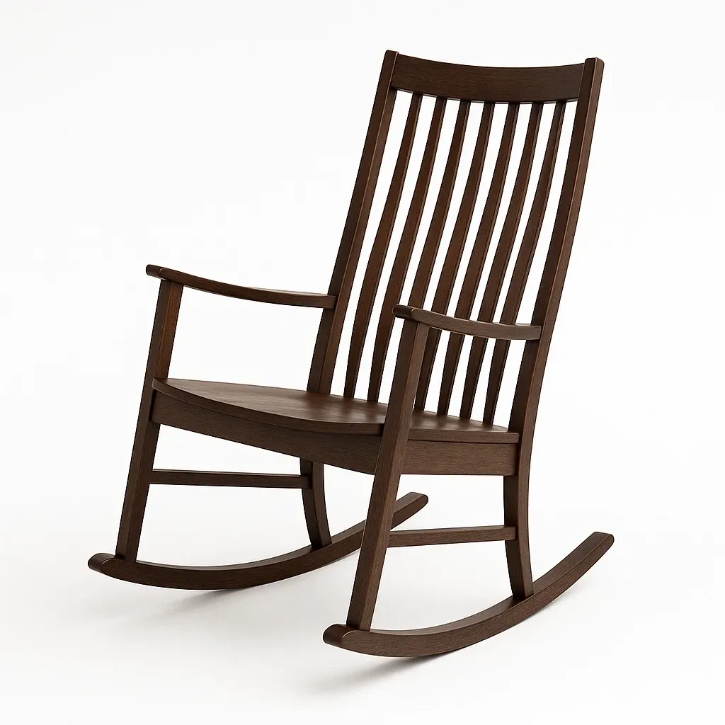 Questa sedia a dondolo in legno è progettata per il riposo o la lettura in ambienti interni ed è caratterizzata da una struttura semplice.